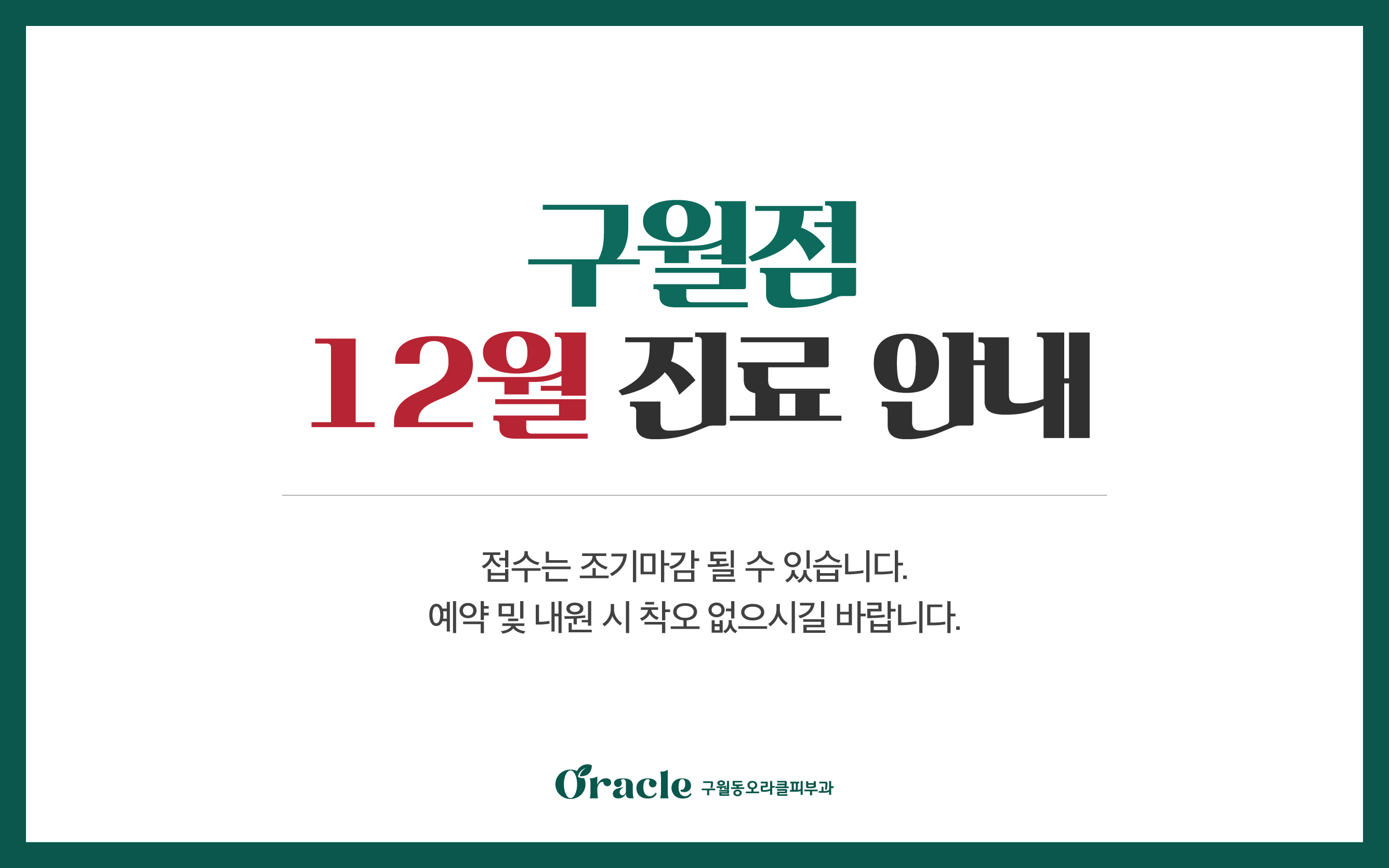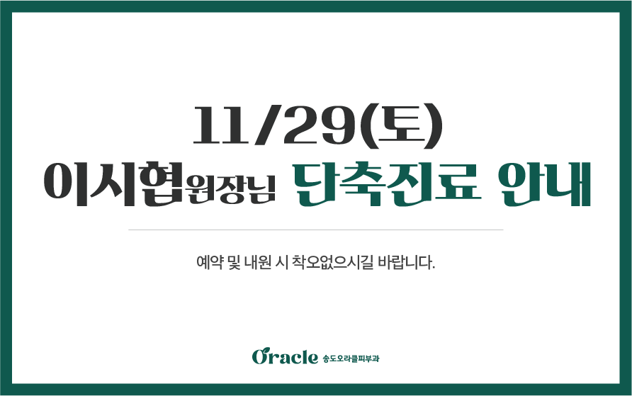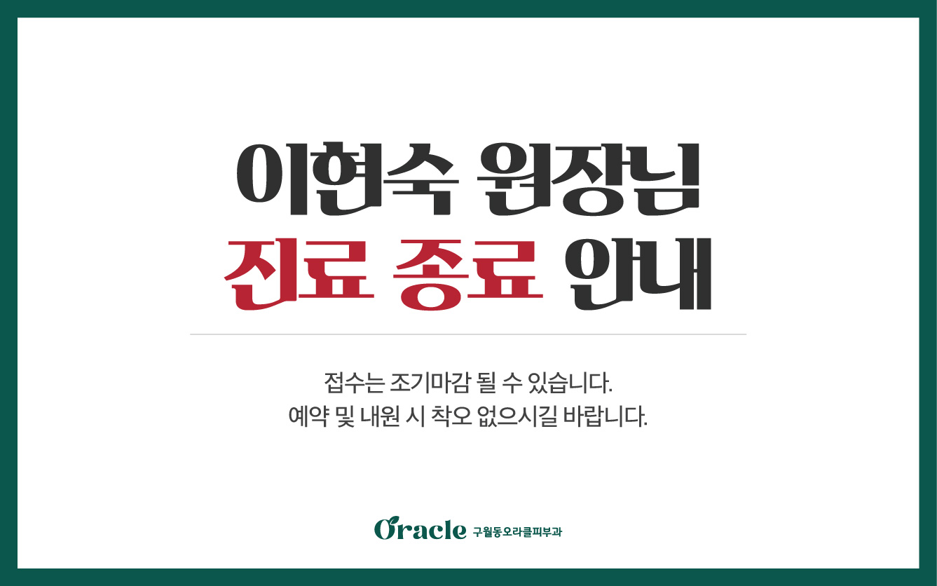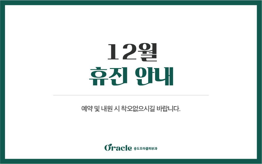 전체구월점송도점 12월 진료안내 2025-11-28 지점명 : 구월점 휴진안내 2025-11-28 지점명 : 12/10 진료시간 일시변경안내 2025-11-25 지점명 : 송도점 11/29 이시협원장님 단축진료 안내 2025-11-24 지점명 : 송도점 송도점 수능 이벤트 2025-11-04 지점명 : 수험생 할인 이벤트 2025-11-03 지점명 : 이현숙 원장님 진료종료 안내 2025-11-03 지점명 : 구월점 리프팅 이벤트 2025-09-01 지점명 : 지방흡입 할인 이벤트 2024-12-26 지점명 : 신분증 확인 의무화 안내 2024-04-08 지점명 : 구월점, 송도점 문신제거 30% 시술지원 2023-12-20 지점명 : 구월동오라클피부과 오시는 길 2023-03-17 지점명 : 열린1페이지 2페이지 맨끝 게시물 검색 검색대상 제목 내용 제목+내용 검색어 필수