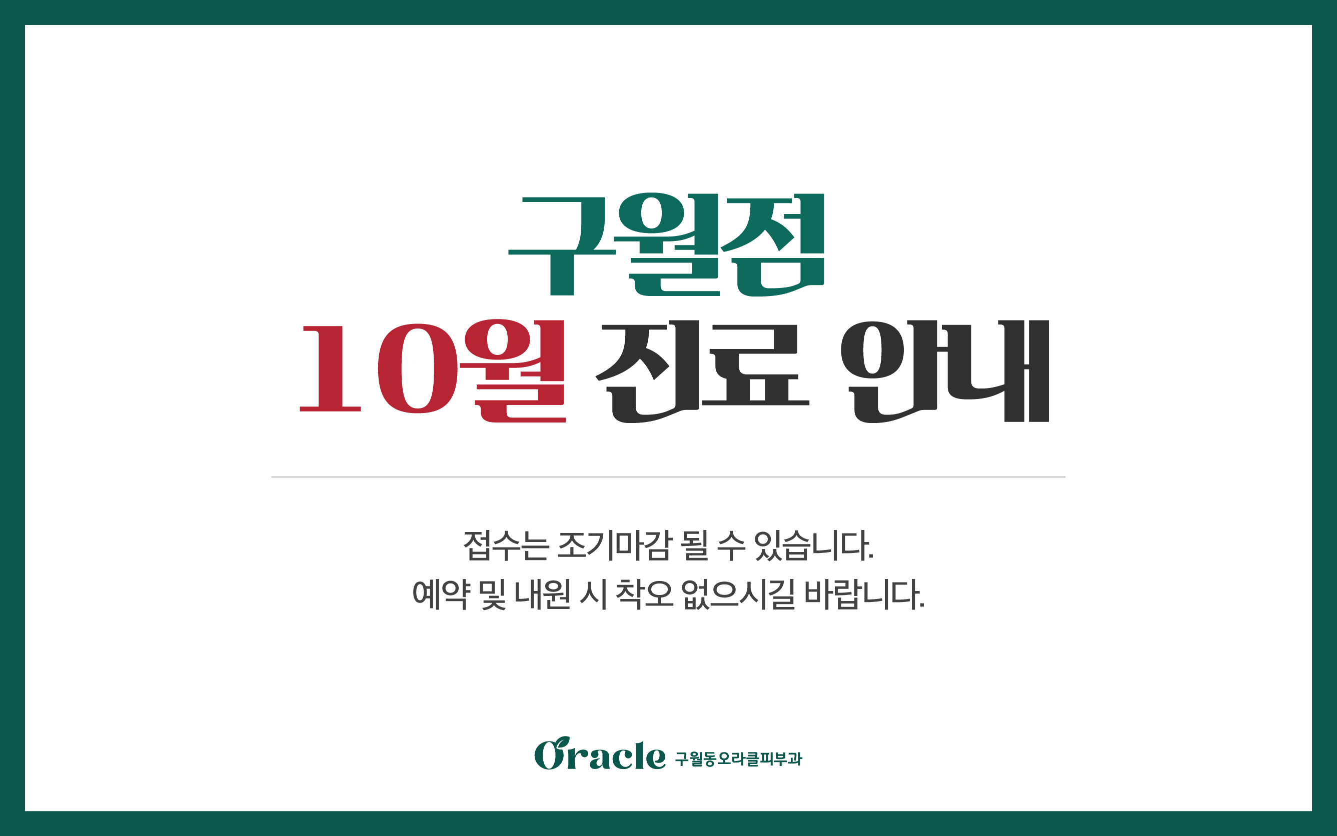 전체구월점송도점 10월 진료안내 2025-09-22 지점명 : 구월점 구월점 휴진안내 2025-09-22 지점명 : 구월점 구월점 리프팅 이벤트 2025-09-01 지점명 : 지방흡입 할인 이벤트 2024-12-26 지점명 : 신분증 확인 의무화 안내 2024-04-08 지점명 : 구월점, 송도점 문신제거 30% 시술지원 2023-12-20 지점명 : 구월동오라클피부과 오시는 길 2023-03-17 지점명 : 일요일 진료 종료안내 2023-08-01 지점명 : 구월점 통합콜센터 운영안내 2023-05-09 지점명 : 구월점, 송도점 제증명 및 진료기록부 사본 발급 신청 시 구비서류 2023-03-08 지점명 : 구월점, 송도점 구월점 & 송도점 통합 홈페이지 오픈 2023-03-14 지점명 : 구월점, 송도점 송도오라클피부과 오시는 길 2023-03-17 지점명 : 송도점 열린1페이지 2페이지 맨끝 게시물 검색 검색대상 제목 내용 제목+내용 검색어 필수